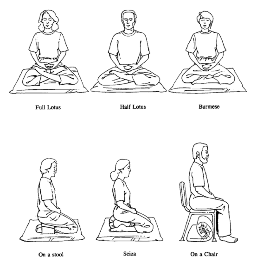 Il existe différentes positions recommandées, comme celle du lotus, assis sur un coussin, etc. Voici des exemples (cliquez pour agrandir) :